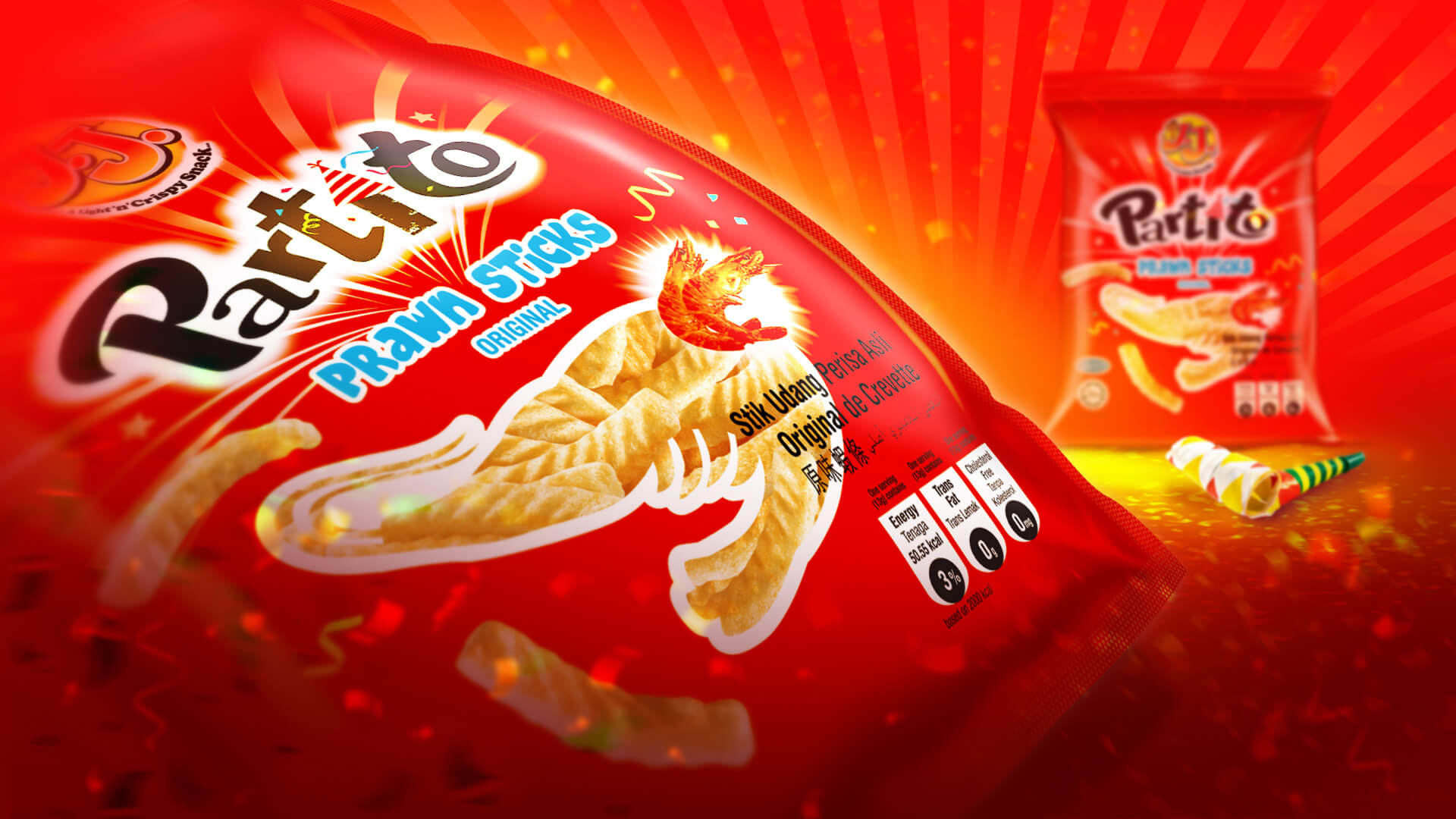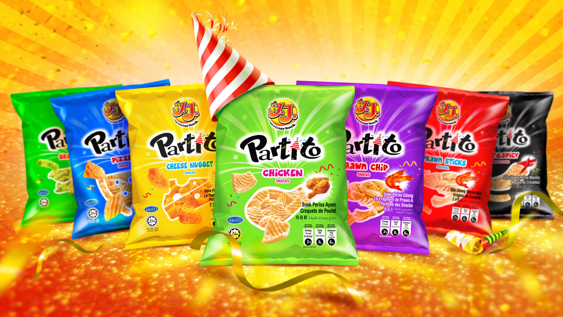 JJ snacks wanted to redesign existing packaging into something more fun and appeal to teenagers as well as kids. Evolved on the idea of fun, party atmosphere, we developed a brand new product name; Partito!.